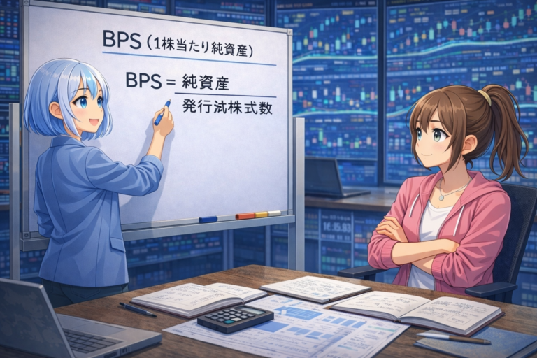 株価だけ見ていると、その企業が高いのか安いのか判断しづらいよね。そこで基準になるのがBPSだ。これは会社が持っている純資産を1株ごとに分けた数字で、「この会社の中身は1株あたりどれくらいの価値があるのか」をシンプルに示してくれる指標なんだ。