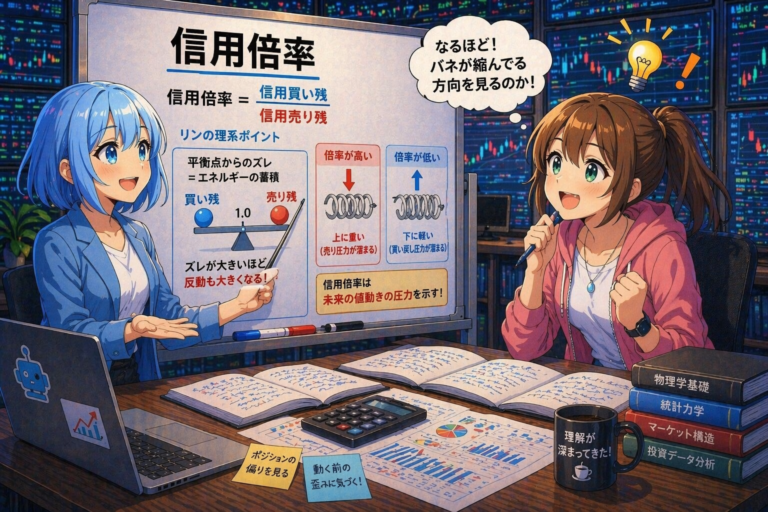ししょの、信用倍率は「バネがどっちに、どれくらい縮んでいるか」を見る数字なんだ。バネの縮みが限界に近いほど、指を離した時の反動(値動き)は凄まじいものになる。その「弾性エネルギー」の向きを計算するのが理系的な予測だよ!